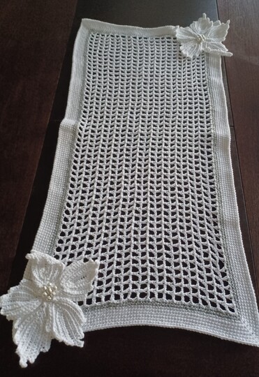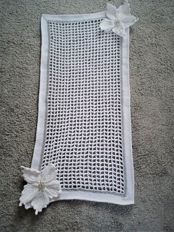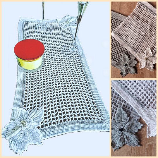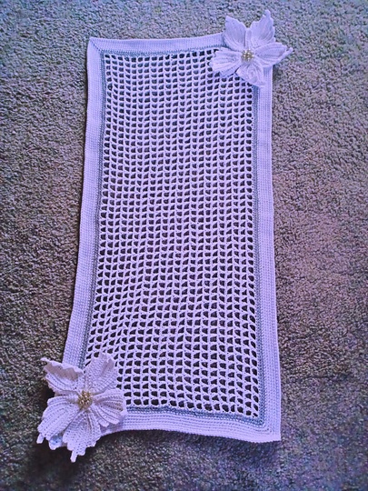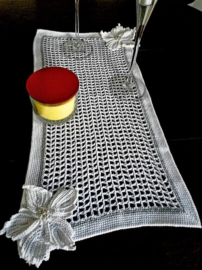Den Tisch hübsch dekorieren, wer mag das nicht ? Für die bald kommende Adventszeit könnt Ihr mit meiner Anleitung einen eleganten Tischläufer häkeln.Das schlichte Grundmodell besticht mit seinen an den Ecken angebrachten Eisblüten und kann mittig noch wundervoll mit Kerzen dekoriert werden.