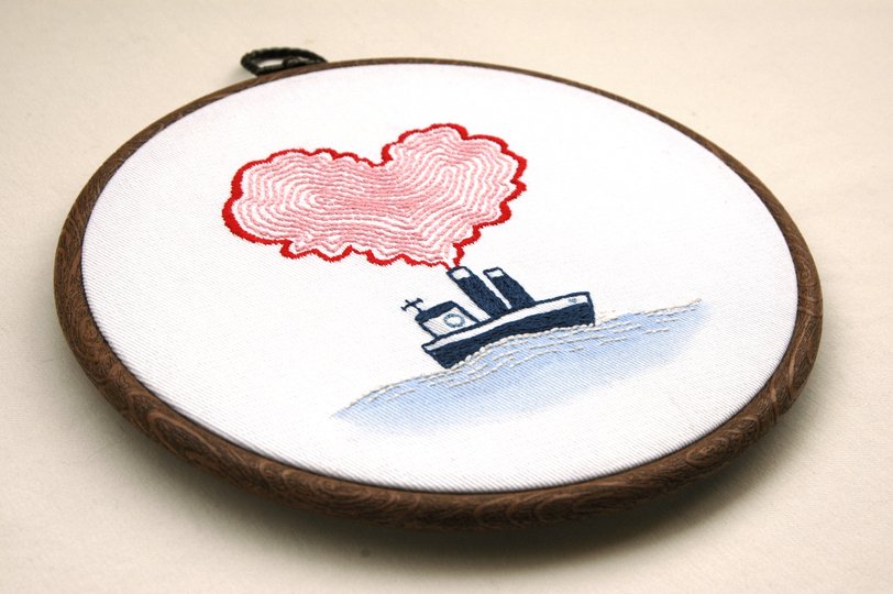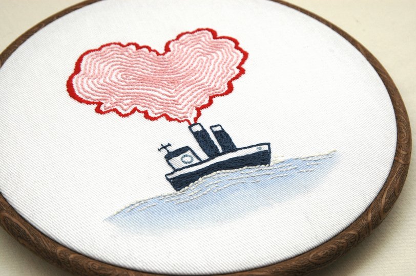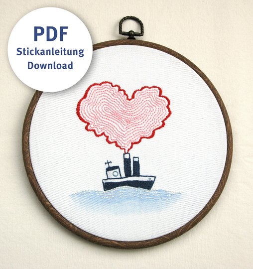 PDF Stickmotiv Vorlage und Anleitung für handgemachte Stickerei/Textilkunst mit maritimem Motiv Dampfer/ Boot und Herz. Die Sprache der Anleitung ist Deutsch.