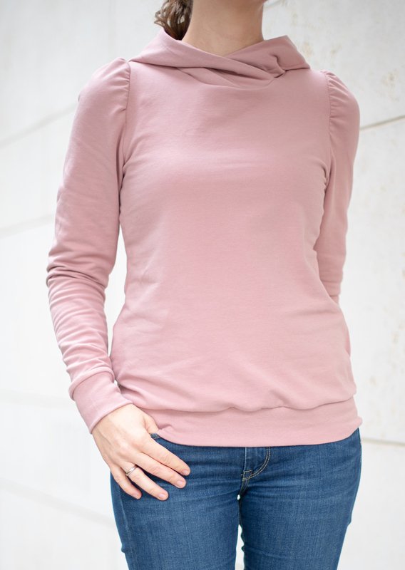 Durch die leicht eingerückten Schultern fallen die romantischen Fältchen der Puffärmel besonders schön und machen eine perfekte Gesamtform. Für den sportlichen Look kannst du dich zwischen Wickel- und normaler Kapuze entscheiden. Zum bürotauglichen Pulli wird Inge mit Bündchen am Halsausschnitt.