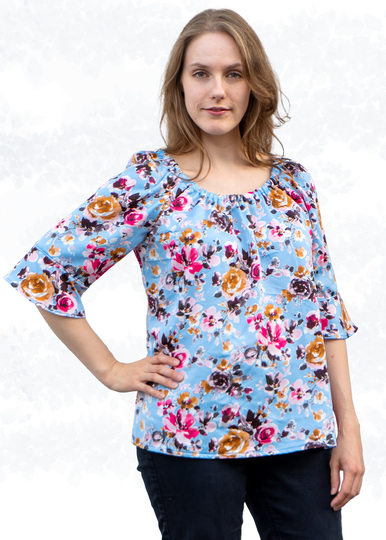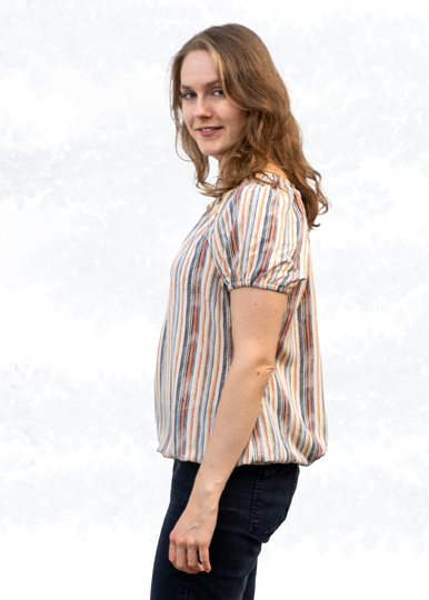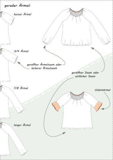 Die Bluse ist hüftumspielend und kann wahlweise locker oder in der Hose getragen werden. Die geraden Ärmel sind weit geschnitten und in vier Längen im Schnittmuster enthalten. Alternativ kannst du die Ärmel mit einem Volant nähen.