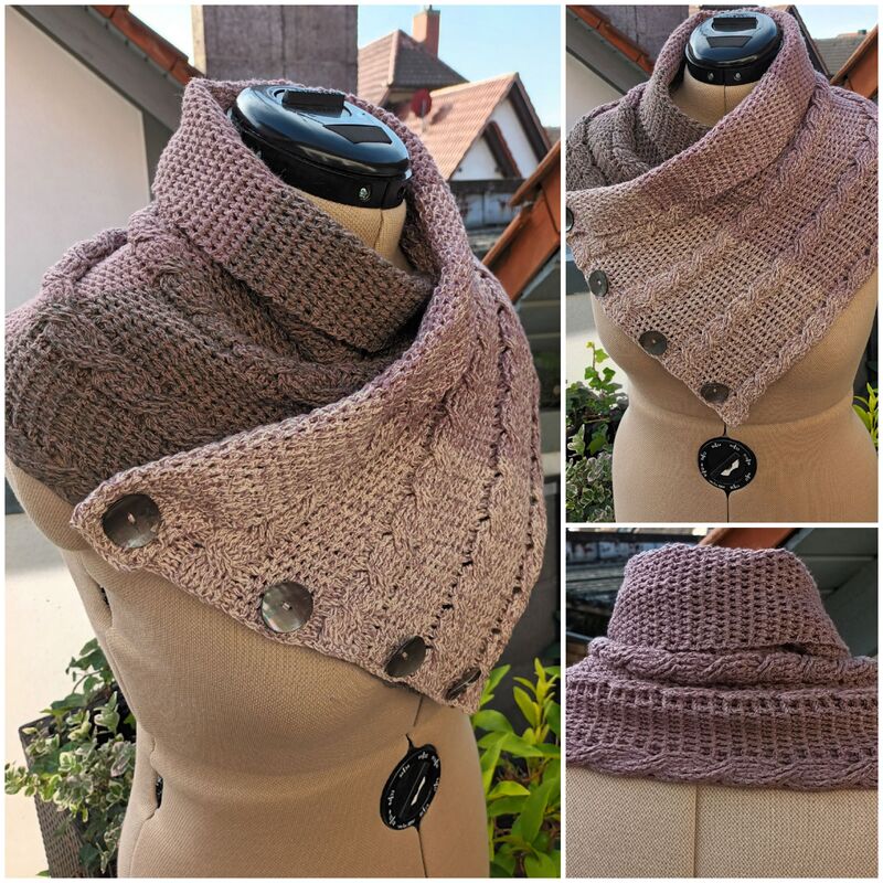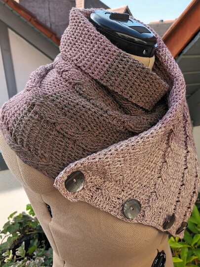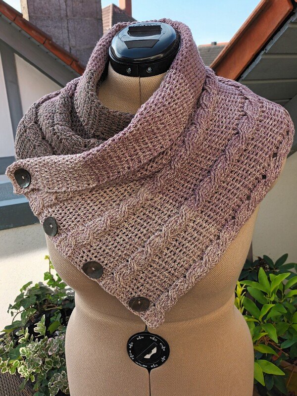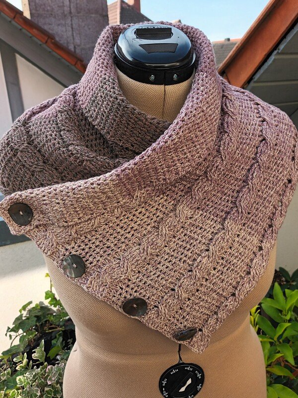 Damit Du deinen Schal trotzdem öffnen und schließen kannst, was ja sehr praktisch sein kann, sind darunter unsichtbar Druckknöpfe angebracht.