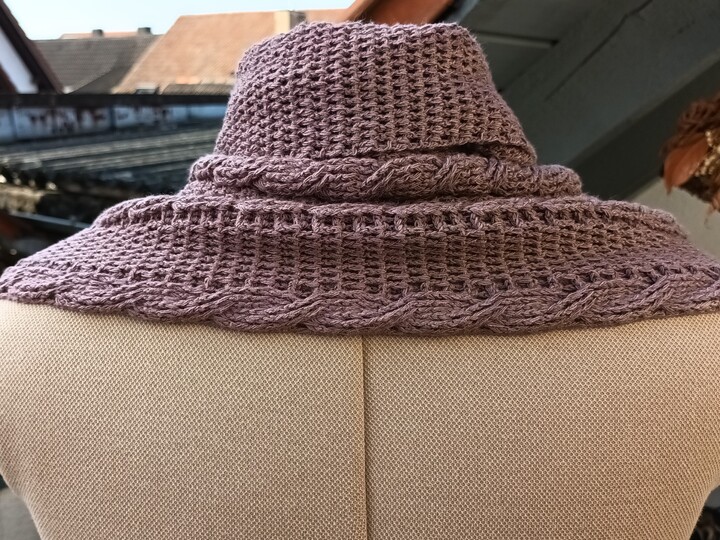 Nach dieser Anleitung kannst Du dir einen modischen Schalkragen mit einem wirkungsvollen Zopfmuster häkeln.