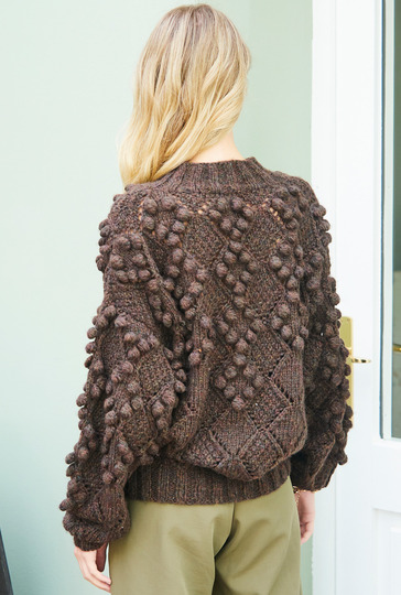 Ein Prachtexemplar von Pullover! Er besticht durch die großen Noppen im rautenförmigen Ajourmuster, das zunächst ohne die Noppen mit glatt rechten und im großen Perlmuster gestrickten Rauten beginnt. Die Bündchen und die Halsausschnittblende werden in 2/2-Rippen gearbeitet. Das Schurwollmischgarn wird mit 7er-Nadeln verarbeitet – es gibt also schnell ein Stück, trotz des aufwendigen Musters. Die Noppen werden während des Strickens mit der Häkelnadel gearbeitet. Die lässige Weite, auch bei den Ärmeln, macht diesen Sweater zu einem absoluten Wohlfühlpulli. Eine Anleitung dazu gibt es für die Größen 36/38, 40/42 und 44/46.