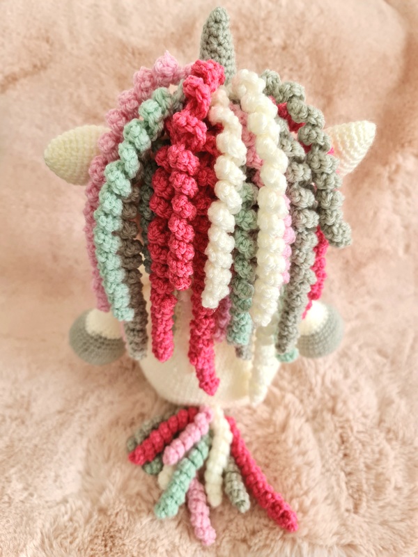 Das Einhorn hat eine Größe von ca. 30 cm. Je nachdem welches Garn du verwendest, dickeres oder dünneres Garn, oder je nach Wahl der Häkelnadel, kannst du eine größeres oder kleineres Einhorn herstellen.