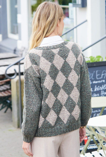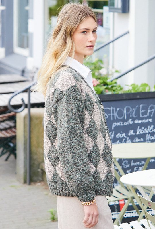 Ganz klassisch und hervorragend fürs Büro geeignet ist dieser Cardigan aus einem tweedartigen Mischgarn aus Baumwolle, Alpaka, Schurwolle und Polyamid. Die Ärmel sind uni in der Farbe Jade gestrickt, Rückenteil und Vorderteile bekommen das typisch englische Rautenmuster. Bündchen und Vorderteilblenden werden als 2/2 Rippen mit Nadeln Nr. 4,5 gearbeitet, ansonsten wird mit Nadeln Nr. 5,5 glatt rechts gestrickt. Geschlossen wird die Jacke mit 5 perlmuttschimmernden Knöpfen. Die Anleitung dazu gibt es für die Größen 36/38, 40/42 und 44/46.