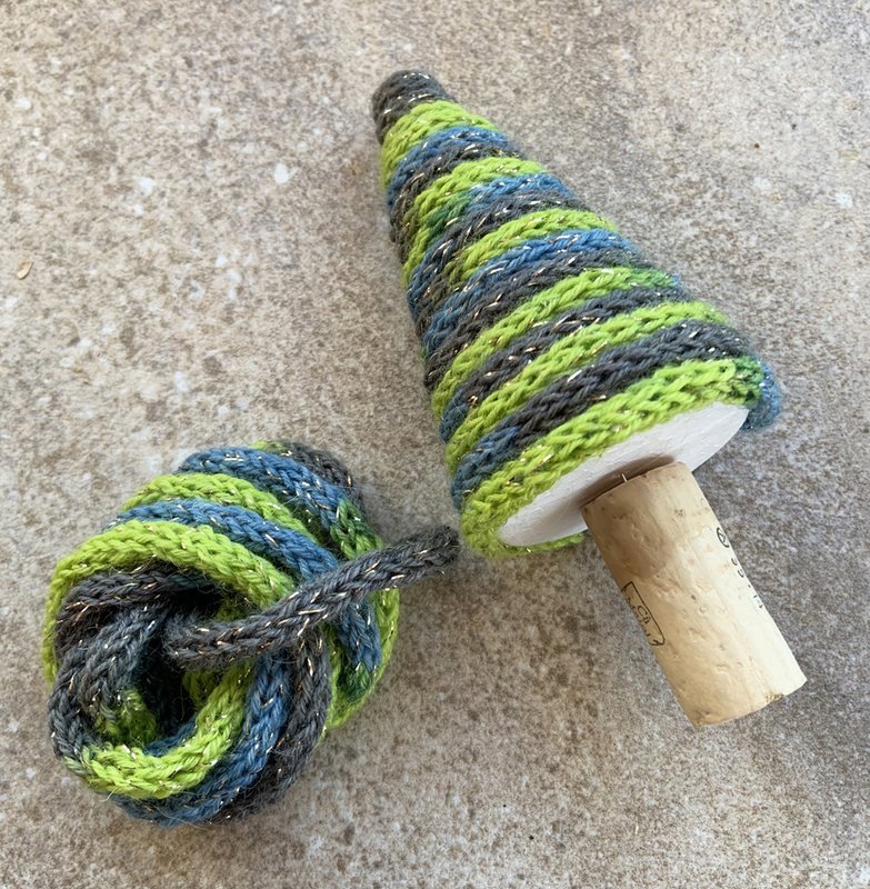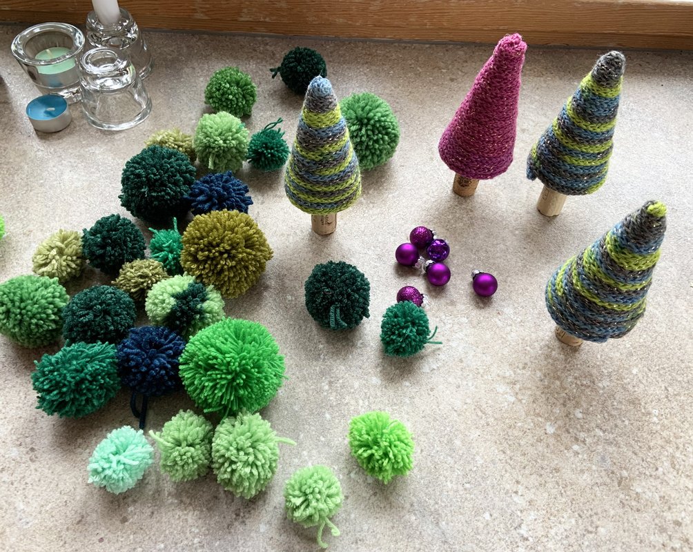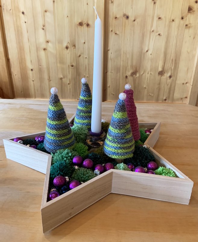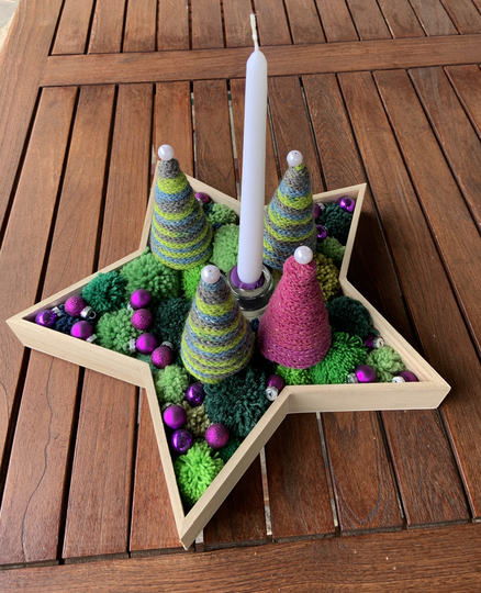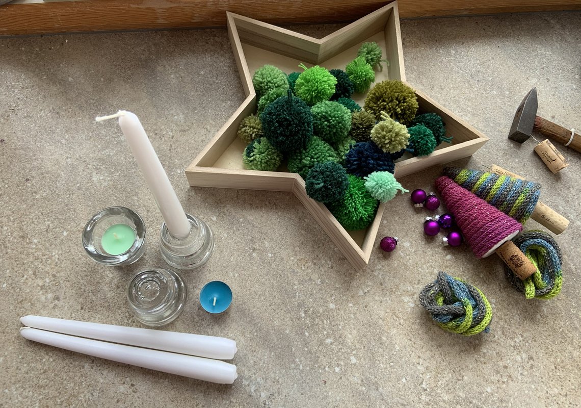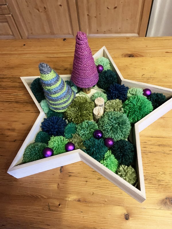 Ein Holztablett in Sternform von Buttinette, oder ein anderes Tablett oder ein Weihnachtsteller, Wollreste in verschiedenen Grüntönen für die Pompoms, 1 größeren Sockenwollrest für die Tannenbäume ebenfalls in Grün und wenn gewünscht in Pink, 1 Beilauf-Goldfaden, mit dem die Schnur zum Aufziehen der Sterne aufgepeppt wird (Glitzer von Woolly Hugs), Pompom-Maker in verschiedenen Größen, 1 Strickliesel, 1 Stopfnadel zum Fädenvernähen, 4 kegelförmige Styroporformen, ca. 11 cm hoch, 4 gleichmäßige Korken (von Weinflaschen), einige Stecknadeln, Styropor-Kleber, 1 paar kleine Weihnachtskugeln zum Drüberstreuseln, 4 Perlen für die Baumspitzen.