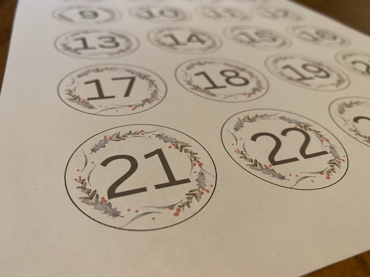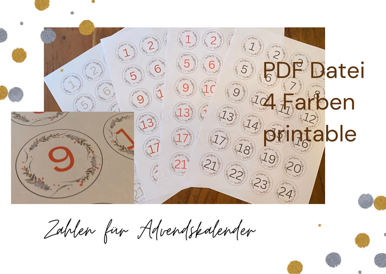 Zum Ausdrucken benötigst du einen handelsüblichen Drucker & Papier nach Wahl. Du kannst die Zahlen auf normalem weissen Druckerpapier drucken und ausschneiden oder dirkekt auf Stickerbogen drucken (dieses Layout ist angepasst an die Avery Zweckform Sticker rund, 24 pro Bogen, 4 cm Durchmesser)
