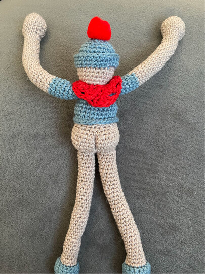 Das Männchen selber wird nur mit festen Maschen gearbeitet. Für das Halstuch braucht Ihr Stäbchen. Außerdem benötigt Ihr noch Luftmaschen, Kettmaschen, den magischen Ring und Maschen verdoppeln und zusammen abmaschen können. Die Arme werden am Ende zB. mit einem einfachen Hohlstich angenäht.