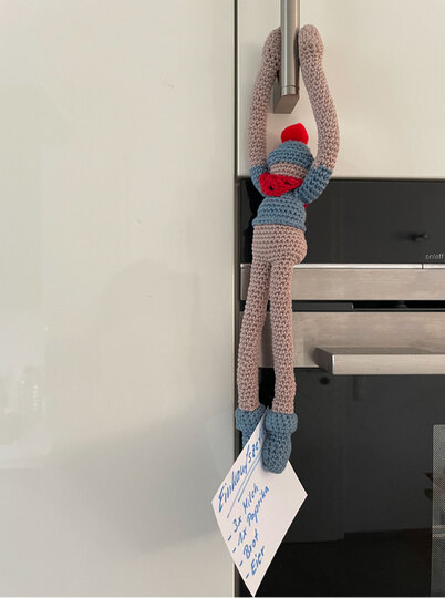 Zubehör: Häkelnadel: 2,5; Füllwatte: Rayher 3315800 hochflauschig (Amazon), 100% Polyester, Verbrauch ca 20g; 10 Stück Neodym-Magnete, selbstklebend, 20mm x 2mm rund & extra stark (Amazon); Nähnadel; Nähgarn; 1 kleinen roten Pompon, ca 1cm Durchmesser