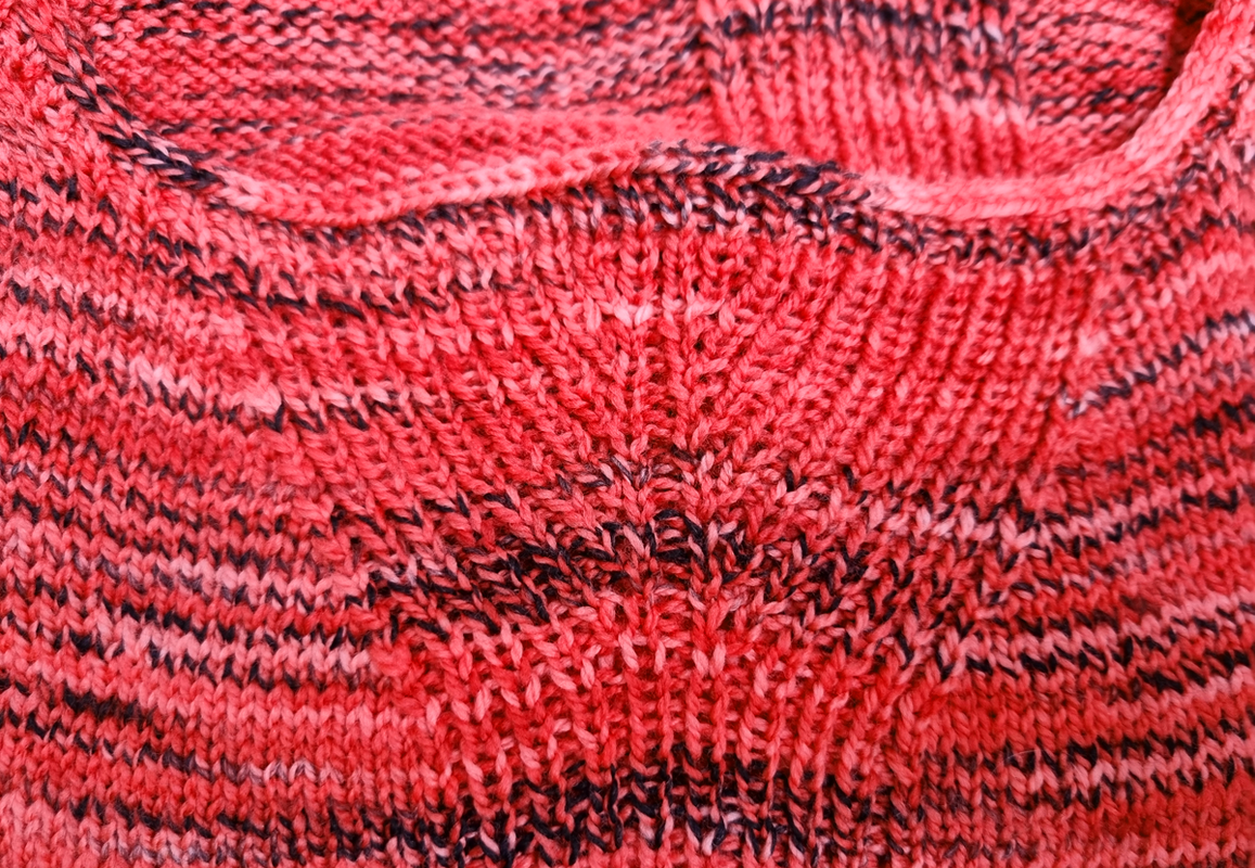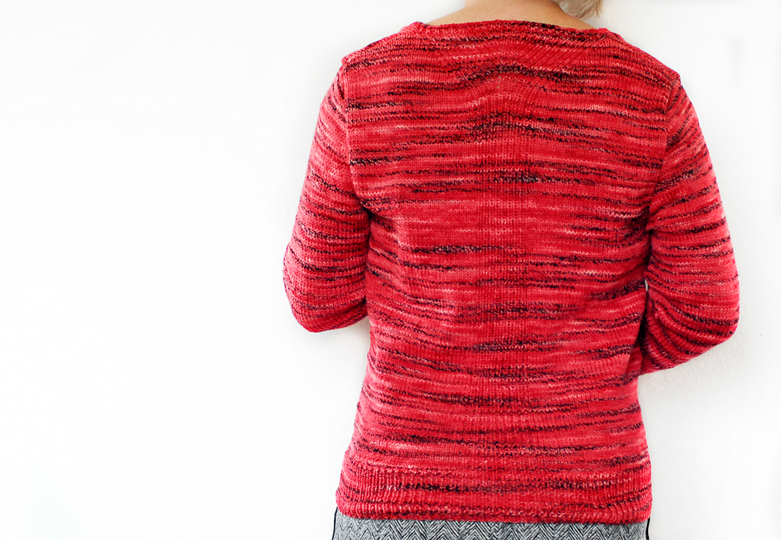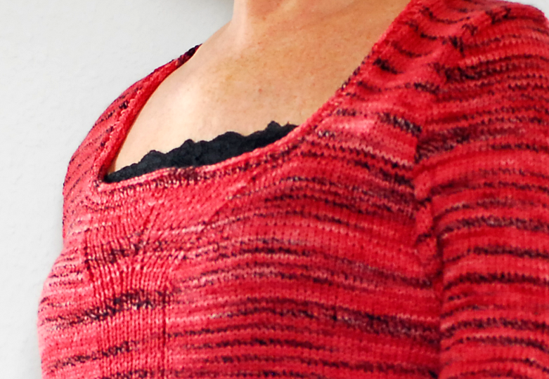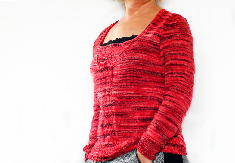 Ein echter "Drüberzieher": Dieser Sweater hat einen tiefen Ausschnitt, der von unten nach oben enger statt weiter wird. Optimal, um Shirts oder Tops darunter zu tragen. Gestrickt wird der Pulli von unten nach oben in Einzelteilen, die anschließend zusammengenäht werden. Das glatt rechts gestrickte Muster wird von einem Streifen im Rippenmuster unterbrochen, der nach oben hin erweitert wird. Die Ärmel haben eine Armkugel, der Halsausschnitt wird mit einem I-Cord-Abschluss umrundet.