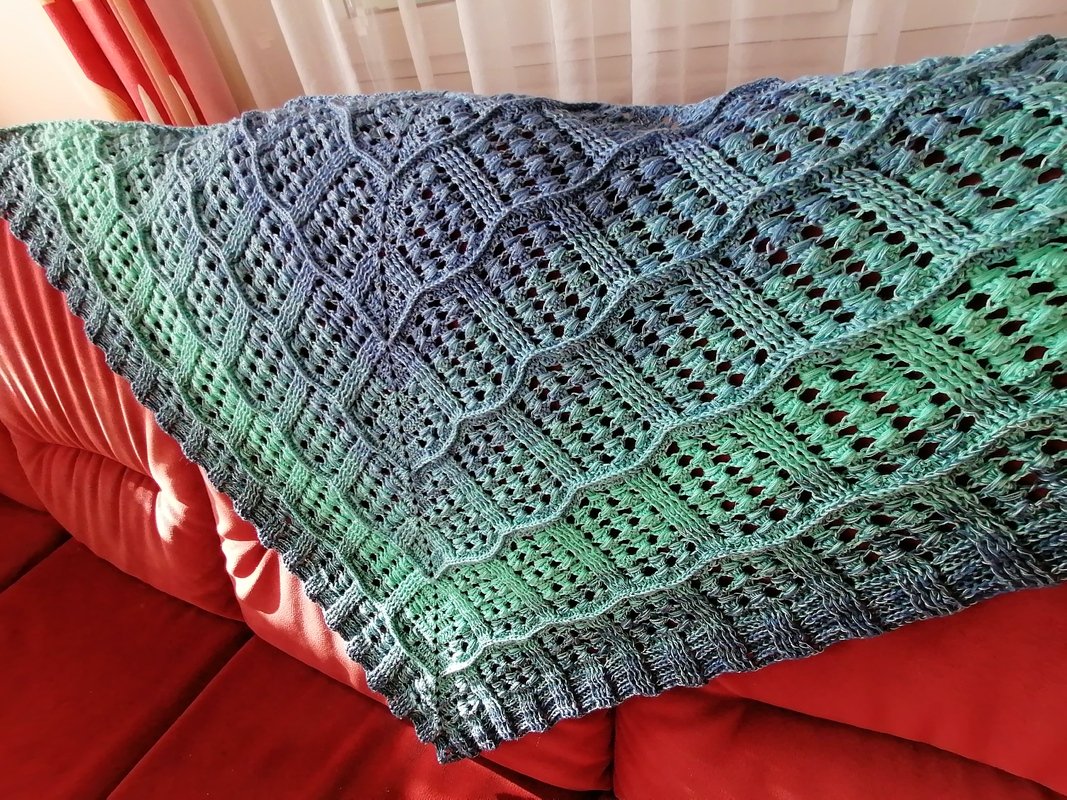 Mit der angegebenen Wolle und Häkelnadel wird das Tuch etwa 160 x 80 cm groß, kann aber beliebig erweitert werden.