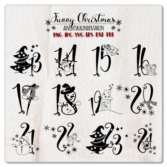 Zahlen 1-24 mit weihnachtlichen Motiven Digitaler Download