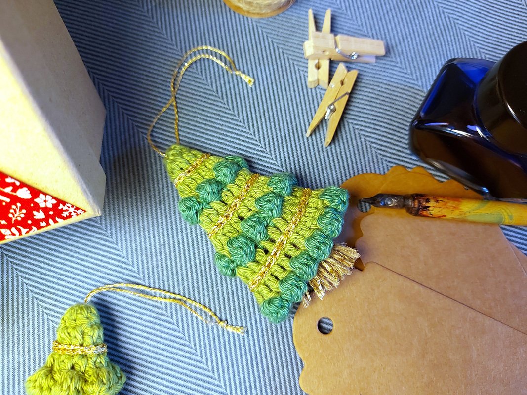Du kannst jede Art von Wolle benutzen, somit toll, um Reste aufzubrauchen. Die Größe des Baums ändert sich natürlich, wenn dickere Wolle benutzt wird.