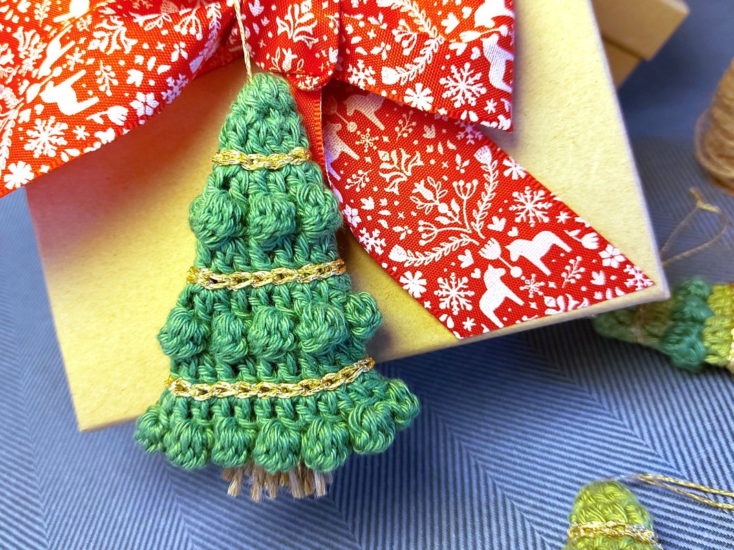 Dieser hübsche Tannenbaum ist ein wunderbarer Anhänger für Geschenkverpackungen, aber er ist auch ein individuelles kleines Geschenk selbst. Er ist ein schnelles Projekt, denn er kann in weniger als einer Stunde gehäkelt werden.