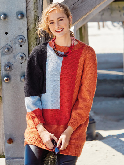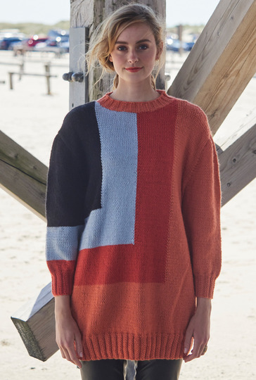 Fast wie ein Kunstwerk von Mondrian mutet dieser Pullover mit großzügigen Farbflächen. Es dominiert in Orange, das auch für die Bündchen und die Blende zum Einsatz kommt. Hellrot, Hellgrau und Schwarz bilden die L-förmigen eingestrickten Flächen. Bündchen und Halsblende sind in 2/2-Rippen gearbeitet, ansonsten wird nur glatt rechts in der sogenannten Intarsientechnik (bei der lediglich beim Farbwechsel in der Reihe die beiden Fäden miteinander verkreuzt werden müssen) gestrickt. Die Ärmel sitzen perfekt, dank Armkugel. Eine Anleitung gibt es für drei Größen: 36/38, 40/42 und 44/46.