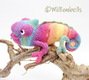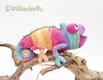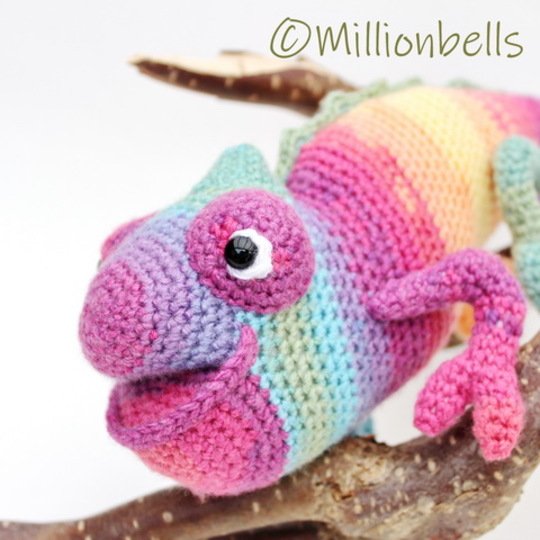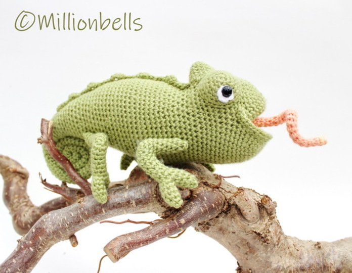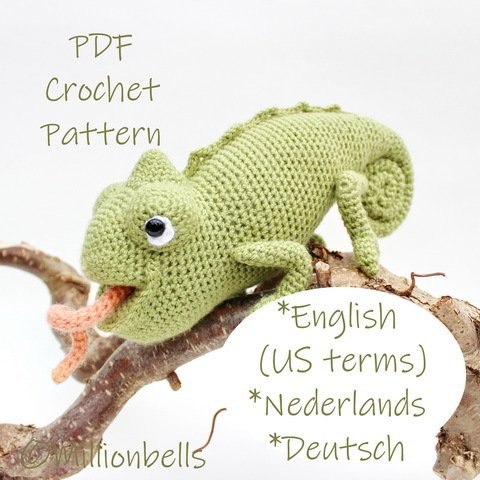 Diese Anleitung beschreibt wie man ein Chamäleons häkelt, wie auf den Bildern gezeigt. Hergestellt aus Acrylgarn (8-fädig / DK) und mit Nadelgröße 3,5 mm, wird das Chamäleon ca. 24 cm lang, ohne Zunge, und ca. 13 cm hoch.