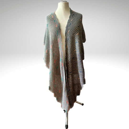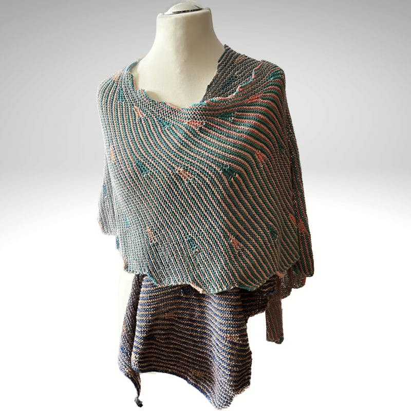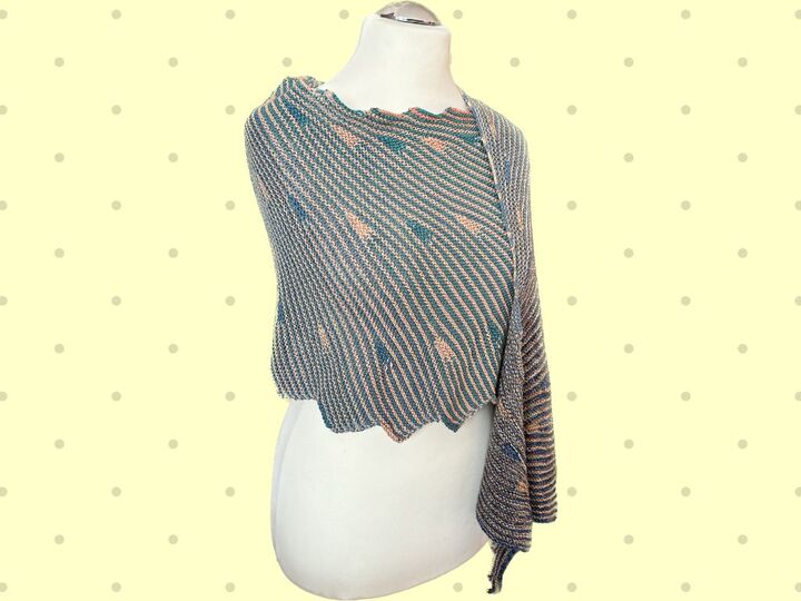 Hier wird ausschließlich kraus rechts gestrickt - also nur rechte Maschen. Das Muster und die Form enstehen durch die Anwendung von verkürzten Reihen. Außerdem kommen zwei Farben zum Einsatz.