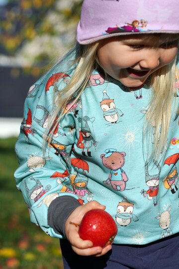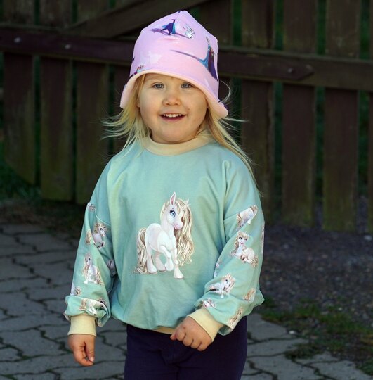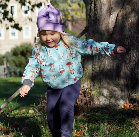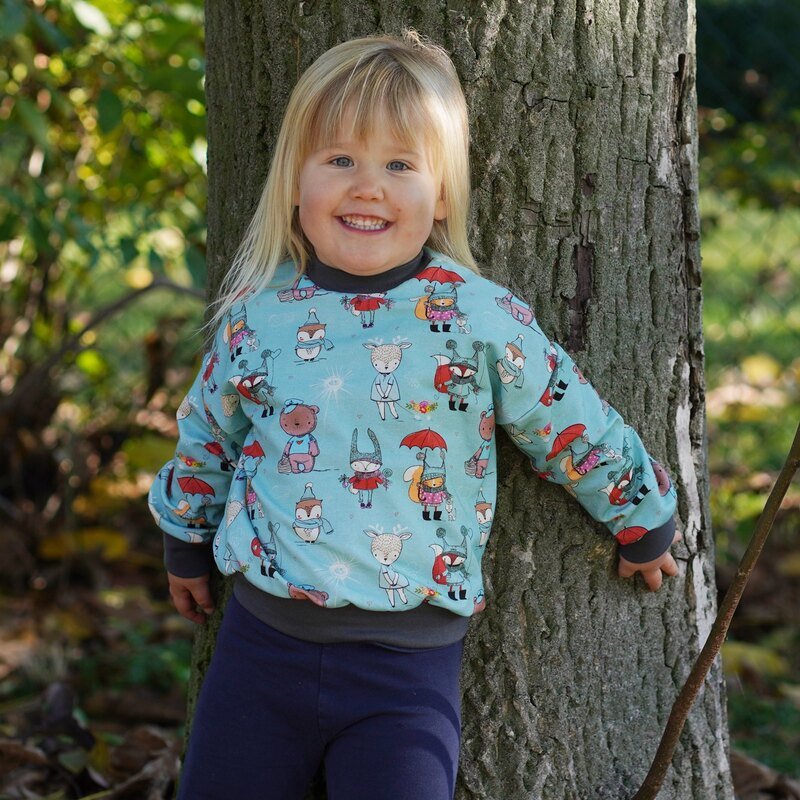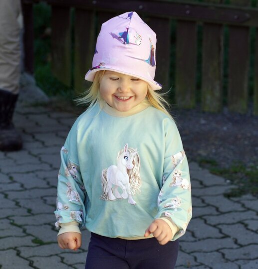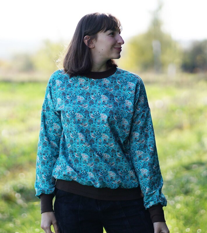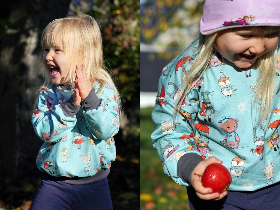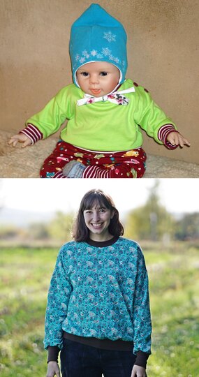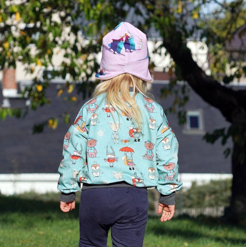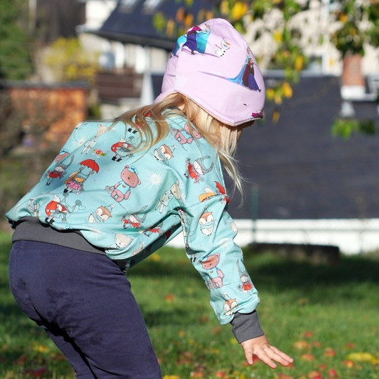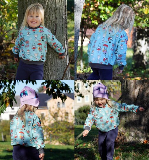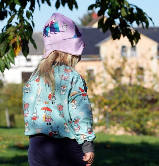 Als Material sind alle elastischen, nicht zu dicken Stoffe geeignet, z.B. Jersey, French Terry und dünner Fleece. Zusätzlich benötigt ihr Bündchenware und bei der Knopfvariante einen Rest Vlieseline H200 und ein paar Druckknöpfe.