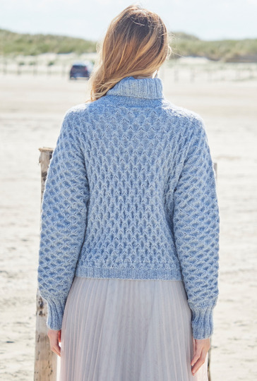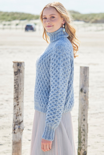 Dieser hellblaue Rollkragenpulli aus anschmiegsamem Alpaka-Schurwolle-Polyamid-Mischgarn hat ein einfach zu strickendes Strukturmuster aus glatt links gestrickten Reihen, die in jeder 8. Reihe mit hochgezogenen Maschen gebildet wird. Gestrickt wird an einem Stück über die Schultern hinweg, wegen der vielen Maschen mit einer Rundstricknadel in Reihen. Die Bündchen und der hohe Rollkragen werden als 2/2-Rippen gestrickt. Und mit 6er-Nadeln gearbeitet, ist der Pulli auch bald fertig. Die Anleitung dazu steht zum Download bereit in den Größen 36/38 und 42/44 sowie 46/48.