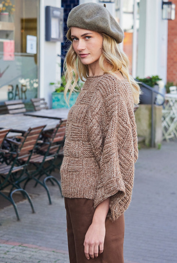 Topmodisch mit Karo-Optik und weiten Fledermausärmeln kommt dieser lässige Sweater daher. Die Karos entstehen durch Rippen aus kraus rechten und Patentmaschen. Dazu ein U-Boot-Ausschnitt, denn es werden nur zwei Teile jeweils mit den halben Ärmeln gestrickt. Gearbeitet wird mit zweierlei Garnen in Beige und Camel, die zweifädig verstrickt werden und so einen melierten Effekt erreichen. Die Mischgarne aus Alpaka, Schurwolle und Baumwolle mit Synthetikbeimischung lassen sich mit 6er-Nadeln flott verstricken. Eine Anleitung steht für die Größen 34/36 und 40/42 sowie 46/48 zur Verfügung.