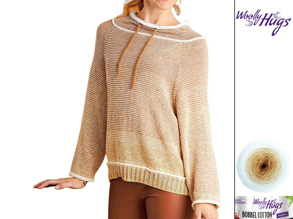 Feine Streifen zieren diesen schönen süßen Pulli. Die Streifen werden in Spiralen, wie bei den Gumgum-Socken gestrickt. Ein Hingucker ist das Detail des Kragens. Eine Kordel wird durch den Bund gezogen.