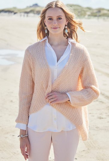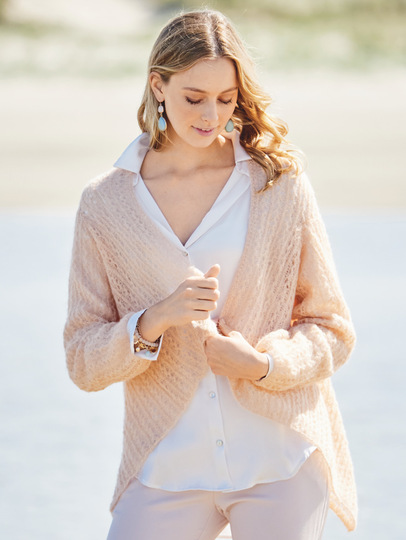 Was spektakulär aussieht, ist im Prinzip ganz einfach: Vorderteile und Rückenteil werden als großes Rechteck gestrickt, in das an zwei Stellen Schlitze eingearbeitet sind. In diese Schlitze werden dann die schmalen Ärmel eingesetzt. Durch diesen einfachen Trick legen sich die Vorderteile so schräg, als hätte man sie diagonal gestrickt. Für dieses flauschig weiche Modell verwendeten wir ein pfirsichfarbenes hochwertiges Garn aus Alpaka und Seide. An das einfache Ajourmuster können sich auch Stricknovizen wagen, wenn sie schon ein klein bisschen Erfahrung haben. Die Anleitung steht für die Größen 36/38, 40/42 und 44/46 bereit.