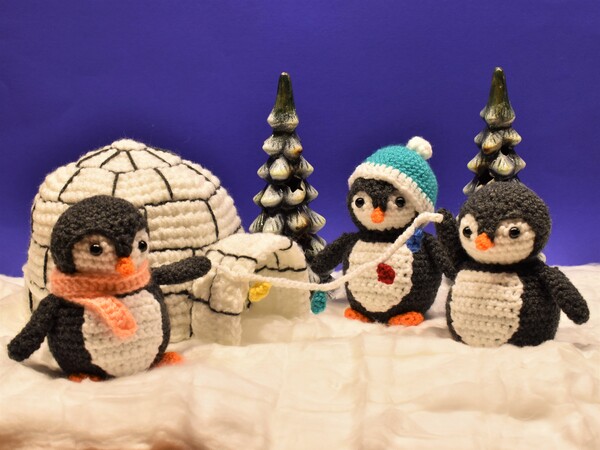 Die PDF-Datei enthält eine ausführliche Schritt-für-Schritt-Anleitung der verschiedenen Teile eines Pinguins mit seinen Accessoires sowie einem Iglu. Es wird gezeigt, wie es zusammengenäht wird.