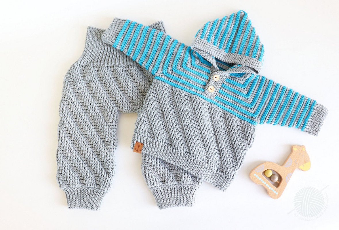 Zwei PDF-Häkelanleitungen bestehend aus bebilderten Anleitungen zum Häkeln von Baby- und Kindepullover "Leon", Gr. 50-128 und Baby- und Kinderhose "Leon", Gr. 50-116. Es handelt sich um zwei Häkelanleitungen, nicht um die fertige Produkte! Diese Häkelanleitungen beinhalten eine genaue Beschreibung und mehrere Fotos (jeweils über 50-70 Fotos).