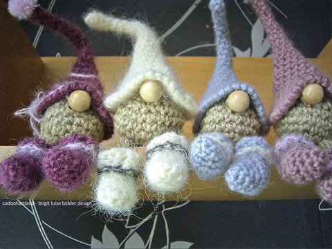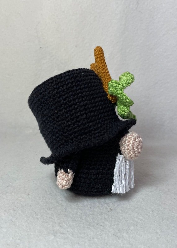 Mit der von mir verwendeten Wolle wird die Figur ca. 20 cm hoch, der Körper hat einen Durchmesser von ca. 5 cm. Bei der Verwendung eines Garns mit einer anderen Nadelstärke wird der Wichtel dementsprechend größer bzw. kleiner.