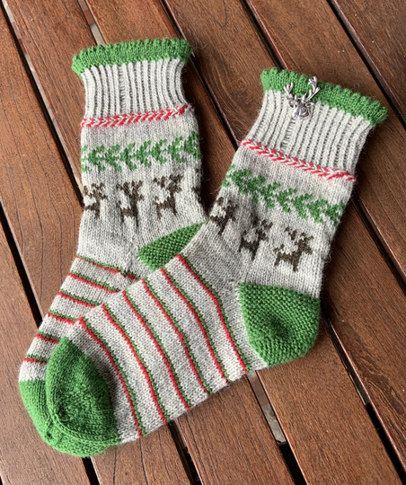 Socken für Kinder in Größe 26 (die durch Verkürzung/Verlängerung auf Gr. 24 bis 28 abgewandelt werden können). Muster Hirsche und Tannennadeln werden eingestrickt (Jacquardtechnik = Muster entsteht durch Faden- und Farbenwechsel). Mausezähnchenborte und Lettische Borte machen die Socken zum einem echten Hingucker, nicht nur zur Weihnachtszeit.