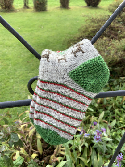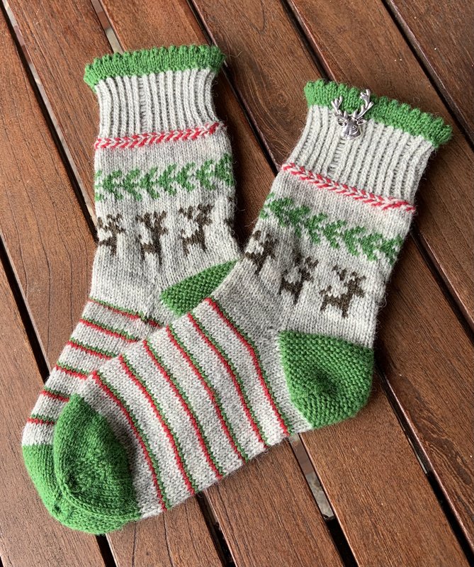 Material: Je 50 Gramm Strumpfwolle von Wolle Rödel, in Natur/Beige, Farbnummer 034, in Rot, Farbnummer 002, in Grün, Farbnummer 017, Superba Premium auch von Wolle Rödel, in Braun, Farbnummer 014, 1 Nadelspiel Stärke 2,5, 1 Stopfnadel mit großem Öhr, 2 kleine Hirschanhänger.