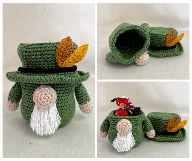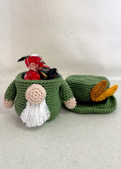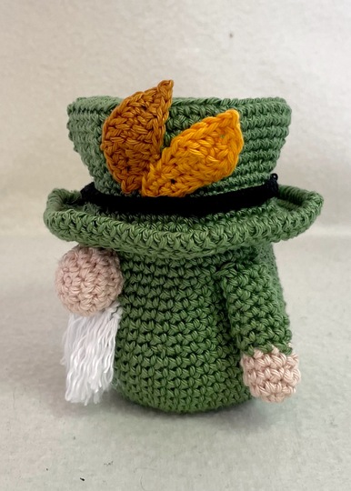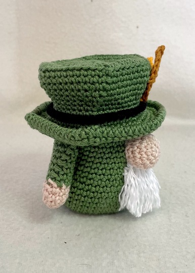 Mit der von mir verwendeten Wolle wird die Figur ca. 20 cm hoch, der Körper hat einen Durchmesser von ca. 5 cm. Bei der Verwendung eines Garns mit einer anderen Nadelstärke wird der Wichtel dementsprechend größer bzw. kleiner.