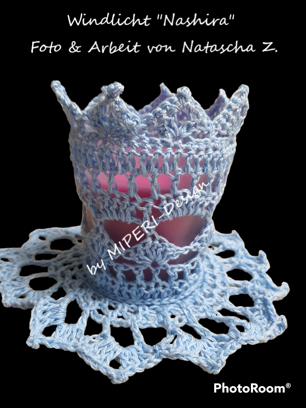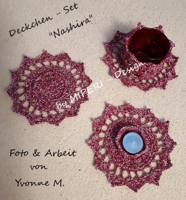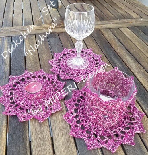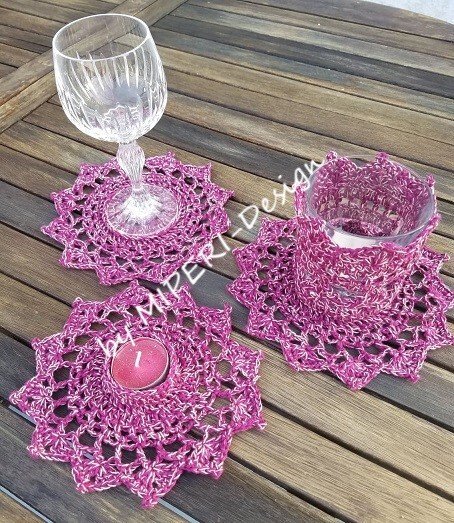 Dies ist ein 3teiliges Set, bestehend aus einem Deckchen oder Glasuntersetzer, einem Windlicht und einem Teelichthalter …. vielleicht das Richtige als Geschenk zu Weohnachten.