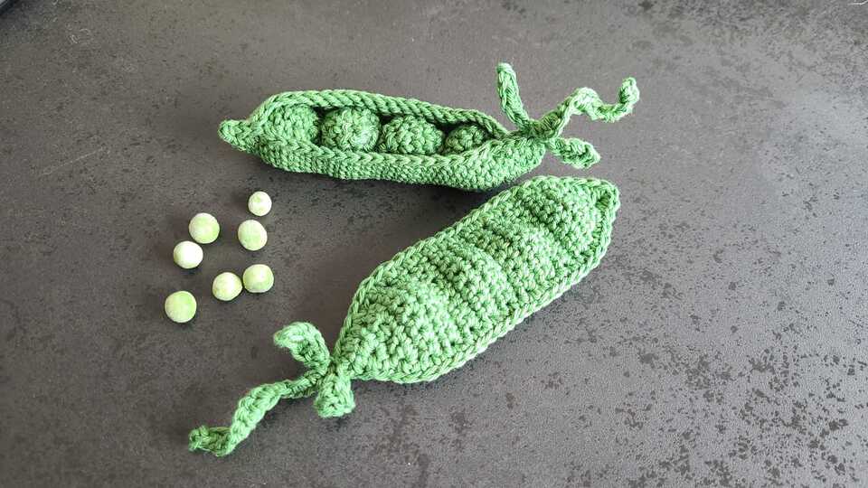 Mit dieser Anleitung kannst du eine geöffnete Erbsenschote mit 4 Erbsen und eine geschlossene Erbsenschote häkeln.