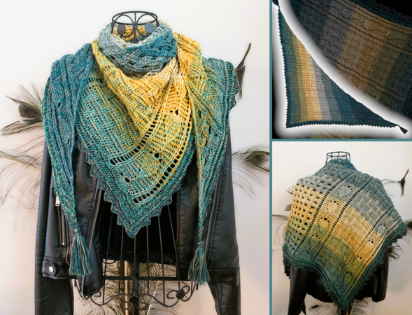 Das Dreieckstuch "Xanthis" besticht dadurch, dass die auffälligen Muster (Blättermuster, Flechtmuster, offenes Flechtmuster" nicht in Reihen gehäkelt werden, sondern nach oben - dadurch braucht die Anleitung ein wenig mehr Aufmerksamkeit, aber es wird auch nicht langweilig!