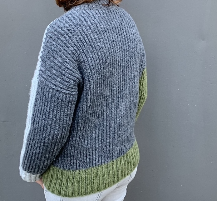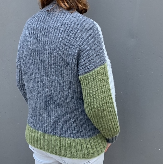 Das Besondere an dem Pullover ist, dass das Vorderteil in Streifen, dass Rückenteil einfarbig und die Ärmel 2farbig gestrickt werden. Der Pullover wird locker von unten nach oben im Halbpatent gestrickt. Die Ärmel sind oversize geschnitten und werden sofort mit angestrickt. Um den Übergang der Farben gleichmäßig hinzubekommen werden diese separat gestrickt und später mittig zusammengenäht. Als Abschluss wird ein Stehkragen im Rippenmuster gestrickt und nach innen umgeschlagen und angenäht.
