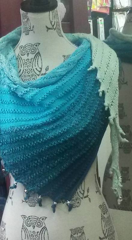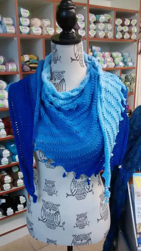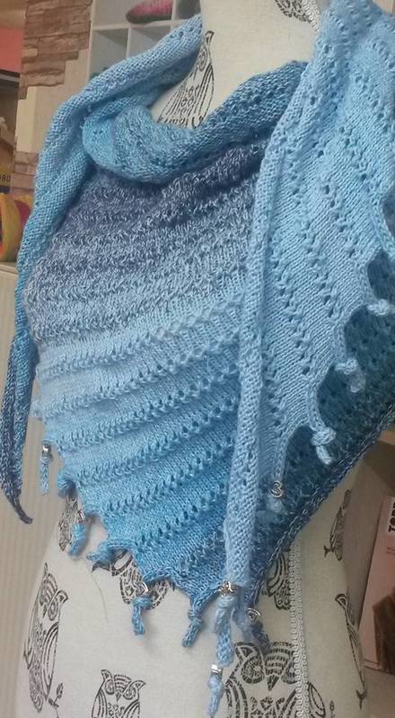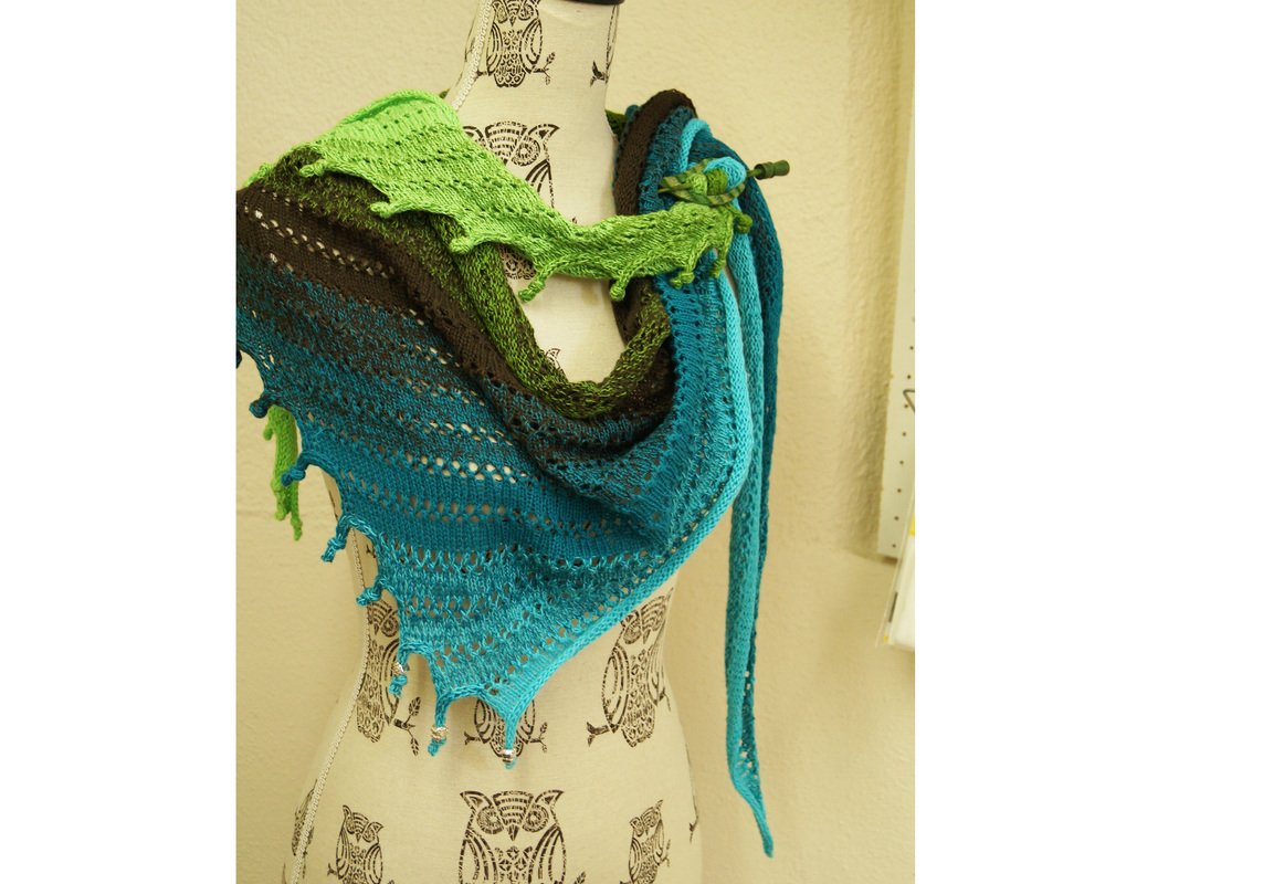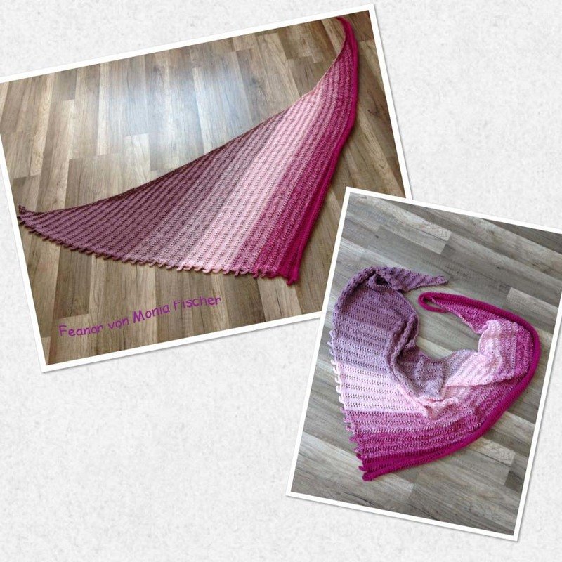 Feanor ist ein schmales Dreiecktuch mit einer schrägen Kante und einer schrägen Kante mit Fransen. Diese werden gleich mit angestrickt deshalb haben sie die jeweilige Farbe der Wolle.