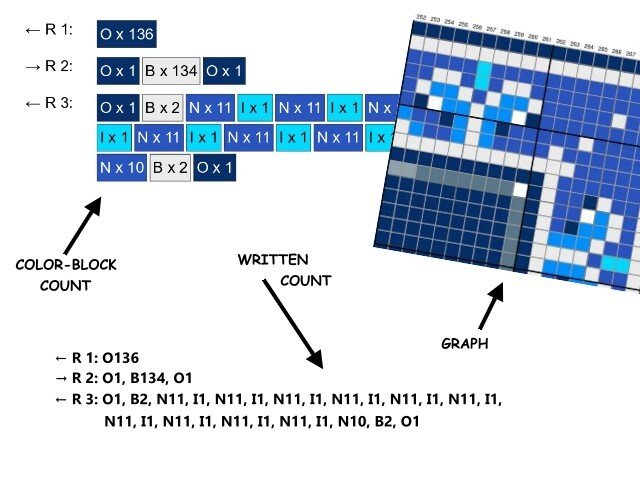 -farbige Zahlen-Blöcke für jede Reihe für feste Maschen (Stb od. hStb)
