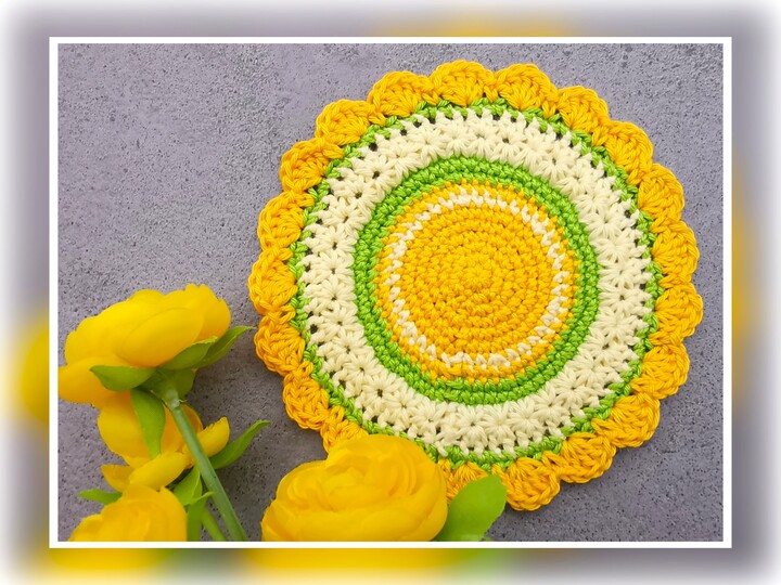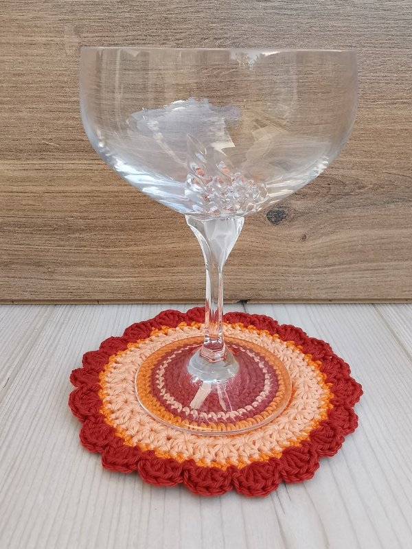 Dieser schöne Untersetzer wird sicher ein Blickfang auf deinem festlich gedeckten Tisch. Dadurch, dass der Innenteil nur mit festen Maschen gehäkelt ist, steht dein Glas/Tasse auf einem festen Untergrund und wackelt nicht.