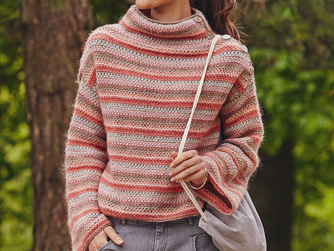 Bei diesem Pulli kommt festliche Stimmung auf, denn mit dem reinen Alpakagarn in Rosa läuft ein silberner Lurexfaden mit eingesponnenen Pailletten mit. Gestrickt wird quer in zwei Teilen. Der imposante Zopf beginnt an einem Ärmelbündchen, geht über Brust bzw. Rücken bis zum anderen Ärmelbündchen. Beidseitig des Zopfs verläuft jeweils eine sogenannte Fallmasche, eine glatt links gestrickte Masche, die ganz am Ende aufgezogen wird. Der schmale Ajourmusterstreifen darüber wiederholt sich innerhalb des Zopfs. Die Anleitung dafür gibt es in den Größen 36/38, 40/42 und 44/46.