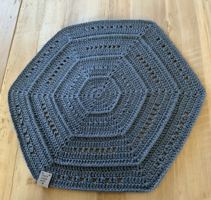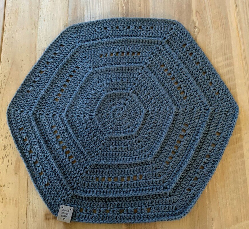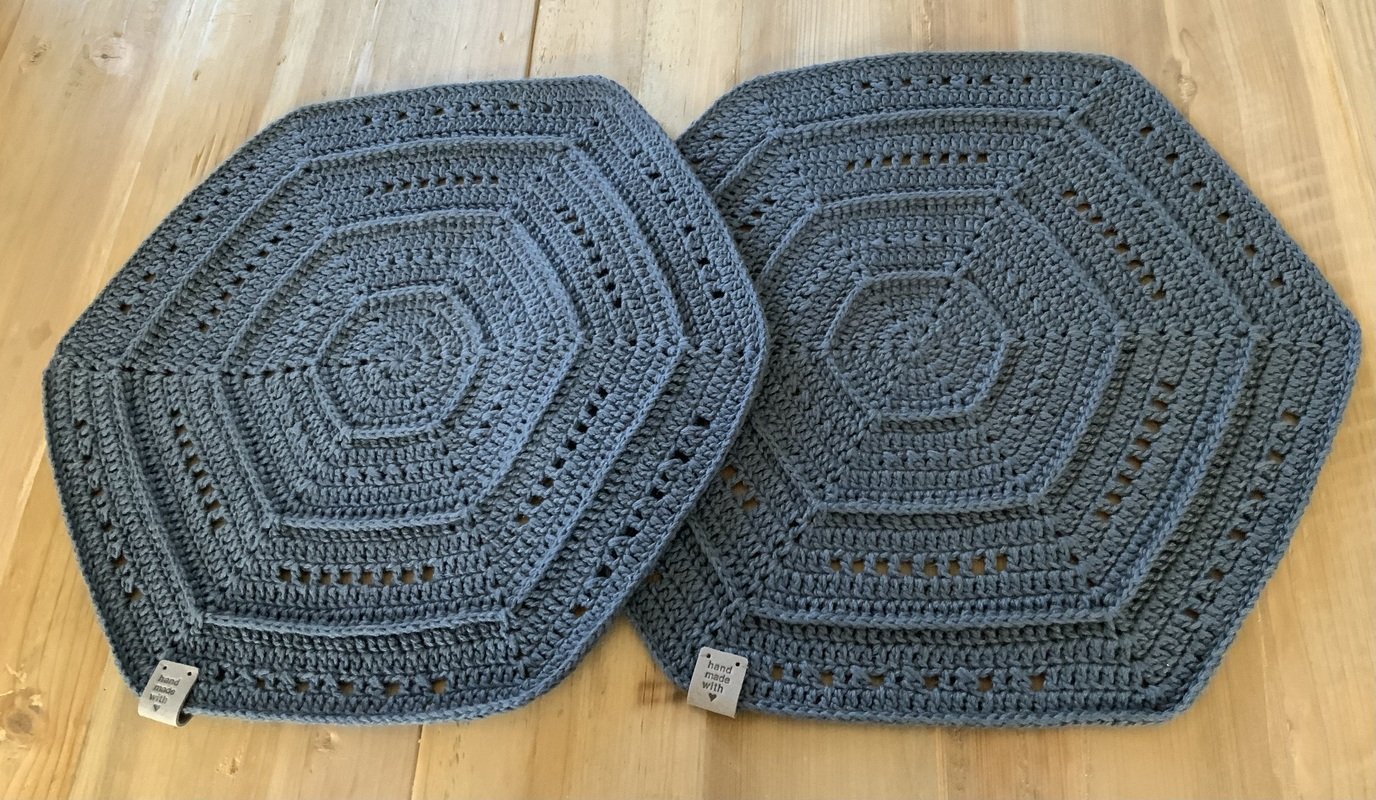 Die Sets aus Rowan „creative linen“ (das sind die in Anthrazit im Bild) haben auch einen Durchmesser von 36 cm und wurden in 19 Runden mit einer Häkelnadel 3,0 gehäkelt.