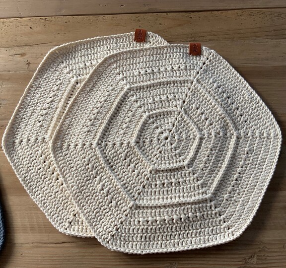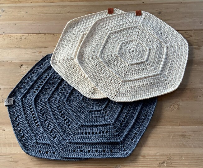 Die Sets aus Drops „Paris oder You 5“ (das sind die naturfarbenen Sets im Bild) haben einen Durchmesser von 36 cm und wurden in 16 Runden mit einer Häkelnadel 4 gehäkelt.