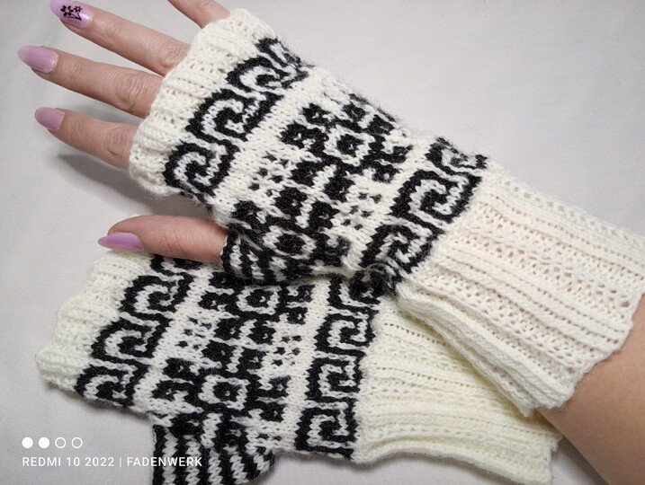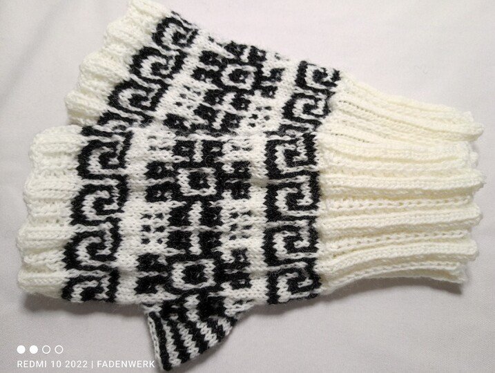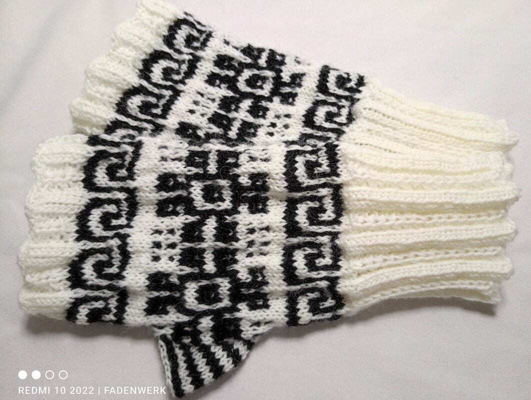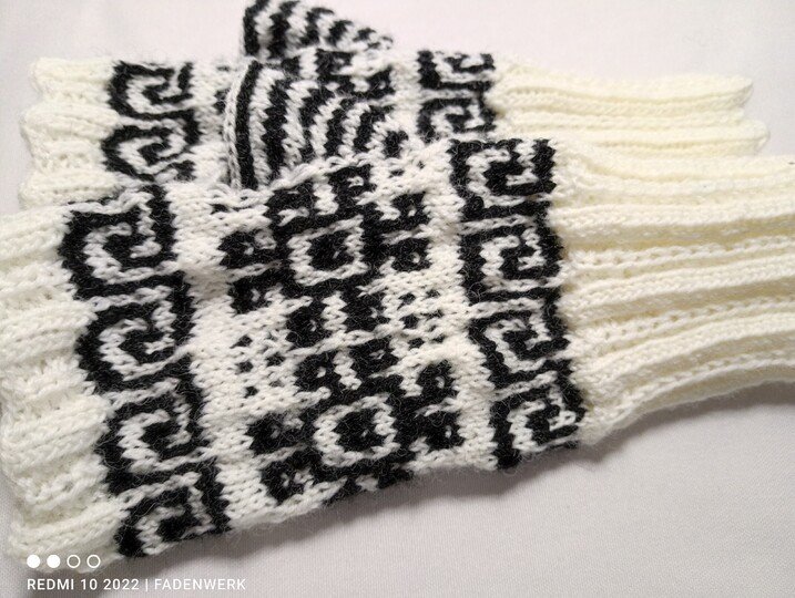 Bei Verwendung von 4-fädiger Sockenwolle und Nadelstärke 2,5 sind die Handstulpen passend bei einem Handumfang von ca 21- 23 cm