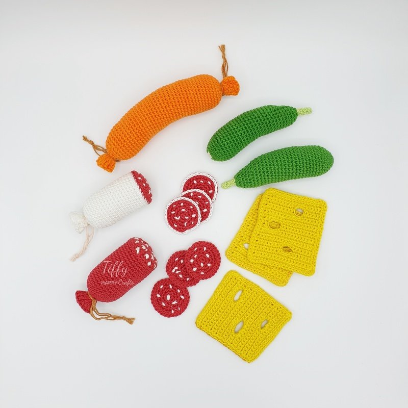 Stellen Sie Ihr eigenes Spielkost-Frühstücksset zusammen (Salami, Wurst, Käsescheibe und Gurke).