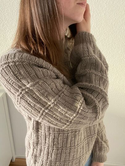 Der Woven Strands Sweater wird nahtlos von oben nach unten im Strukturmuster gestrickt. Dabei wird die Schulterpartie mittels Raglan-Zunahmen geformt. Nachdem die Zunahmen beendet sind, werden die Ärmel stillgelegt und der Körper wird weiter in Runden gestrickt. Unmittelbar vor dem Bündchen werden ein paar Maschen abgenommen, damit das Bündchen etwas enger sitzt. Die Ärmel werden in Runden gestrickt und sind weit geschnitten. Auch hier werden vor dem Bündchen wieder ein paar Abnahmen gestrickt, um das Bündchen etwas enger zu machen.