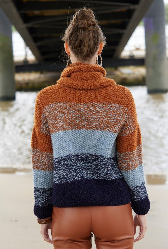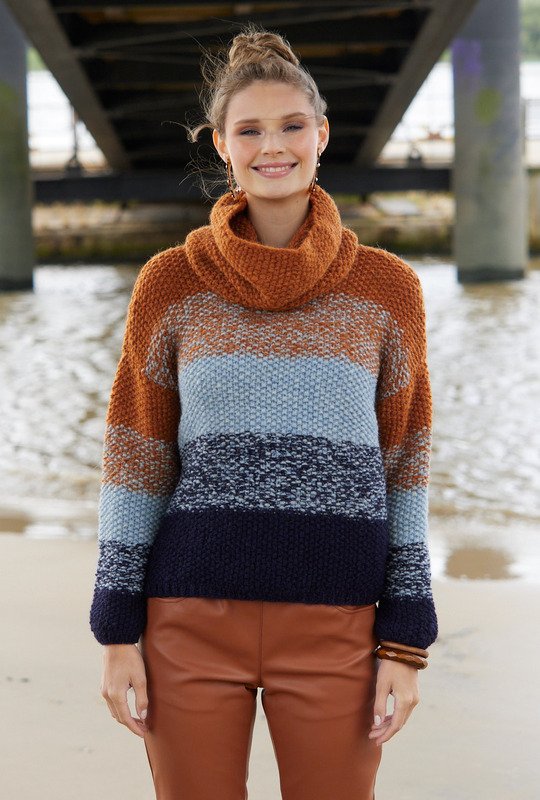 Drei Farben entstehen durch die doppelfädige Strickweise dieses Pullis zwischen klaren Streifen in Nachtblau, Hellblau und Rostbraun melierte Streifen aus der Mischung von jeweils zwei angrenzenden Farben. Der oversize geschnittene Sweater mit extra gestricktem Loop , der wie ein Rollkragen getragen wird, ist so bequem, dass man/frau ihn am liebsten ständig tragen will. Kann man machen, denn die Farben passen zu vielen Garderobenteilen, ob Jeans oder unifarbener Stoffhose. Außer den Bündchen, die als 1/1-Rippen gestrickt sind, wird alles im kleinen Perlmuster geschrieben. Die Anleitung steht für die Größen 36/38, 40/42 und 44/46 sowie für den Loop mit 34 cm x 61,5 cm Umfang zur Verfügung.