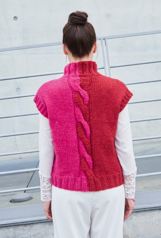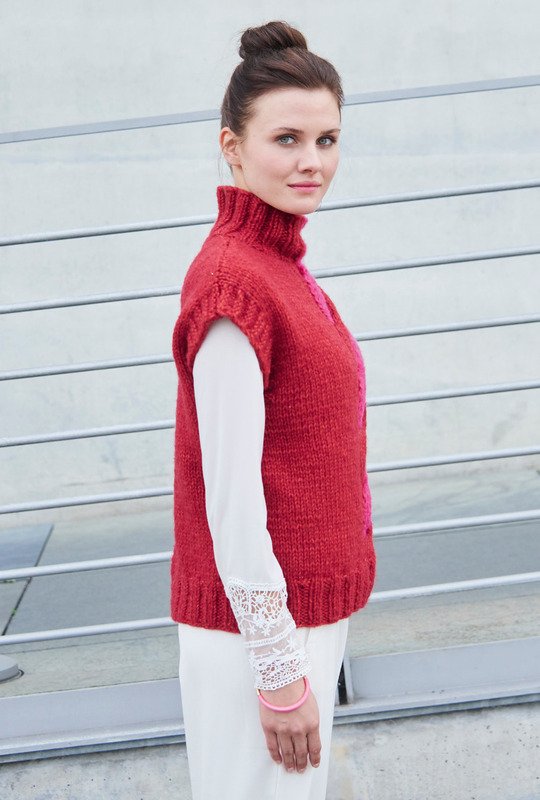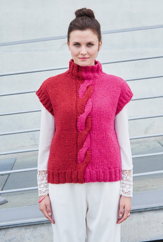 Zwei Rottöne, die jeder für sich intensiv leuchtet: auf der einen Seite Weinrot, auf der anderen Pink. In der Pullundermitte (sowohl im Vorder- als auch im Rückenteil) vereinen sich beide Farben zu einem markanten Zopf. Vorder- und Rückenteil werden ohne Armausschnittrundung gestrickt, stattdessen wird entlang der Armausschnittöffnungen gleich das Querrippenmuster abwechselnd glatt rechts und glatt links gearbeitet. Der Bund wie auch der hohe Kragen sind in breiten 2/2-Rippen gestrickt. Die Anleitung steht für die Größen 36/38 und 40/42 sowie 44/46 bereit.