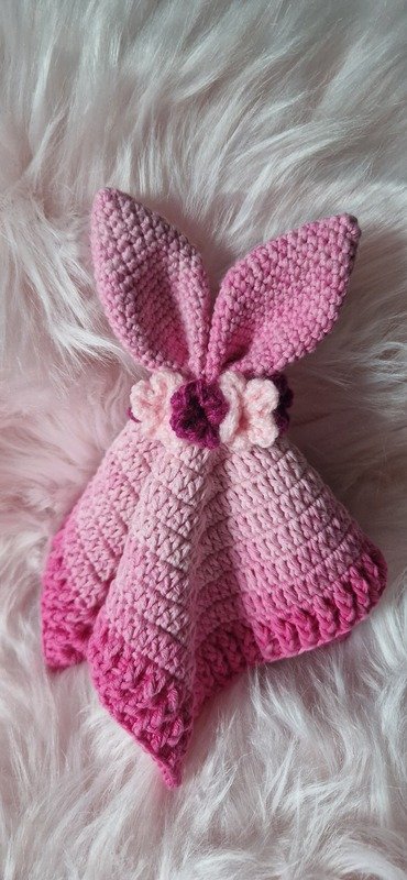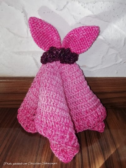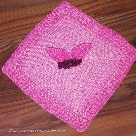 Das fertige Schmusetuch misst ca. 22 cm mit der angegebenen Wolle und Nadelstärke.