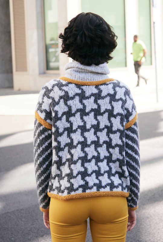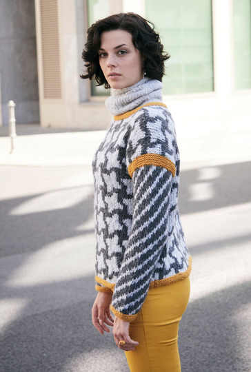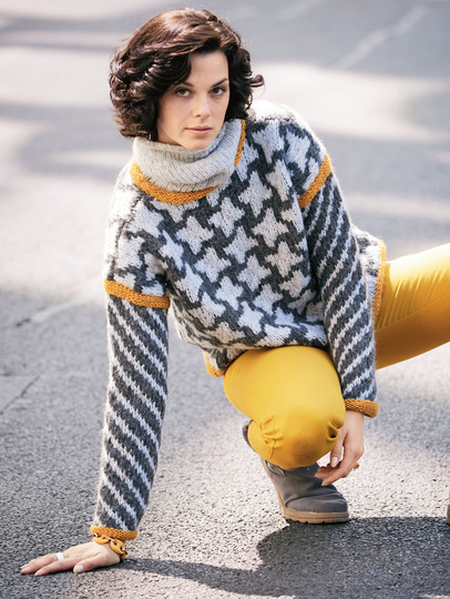 Schick mit enger Hose und Ankle Boots oder auch casual zur Jeans? Beim Styling dieses Pullis aus Schurwolle-Alpaka-Mischgarn mit zweierlei Jacquardmuster in Hellgrau und Anthrazit und Rollkragen ist alles möglich. Die Jacquardmuster sind getrennt mit gelben glatt links gestrickten Streifen, die auch die Saumblenden bilden. Der glatt rechts gearbeitete Rollkragen wirkt, als sei er extra gestrickt, jedoch wird er gleich an die gelbe Halsausschnittblende angestrickt und bekommt als Abschluss einen I-Cord-Rand. Die Anleitung steht in den Größen 38/40, 44 und 48/50 zum Download bereit.