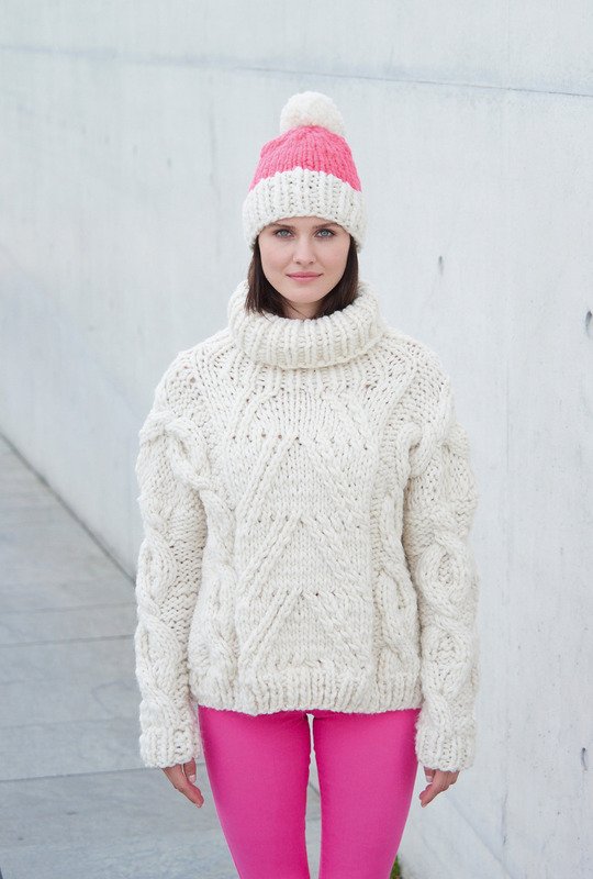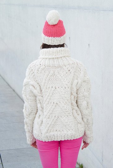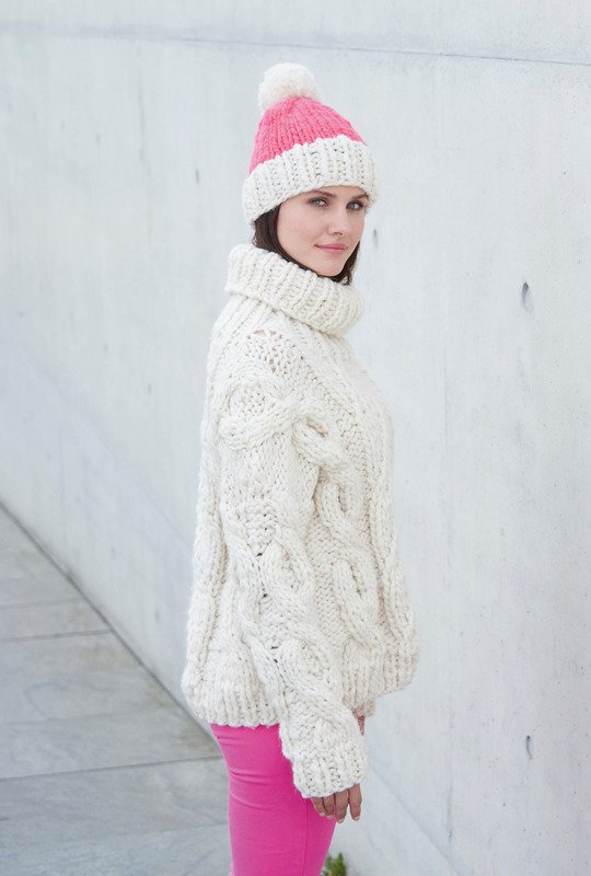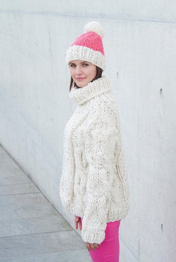Dieser wollweiße Rollkragenpulli kann schon mal die Jacke ersetzen. Er besticht durch seine unterschiedlichen Zopfmuster, die durch das dicke Wollgarn sehr plastisch hervortreten. Das reine Schurwollgarn wird mit 12er-Nadeln verstrickt, was ein schnelles Vorankommen garantiert. Die passende Pudelmütze aus dem gleichen Material sorgt mit ihrem kraftvollen Pink bei der glatt rechts gestrickten Fläche, dem weißen Rippenbund und einem dicken weißen Bommel für einen weiteren Wow-Effekt. Zum Downloaden gibt es die Anleitung in den Größen 36/38, 40/42 und 44/46.